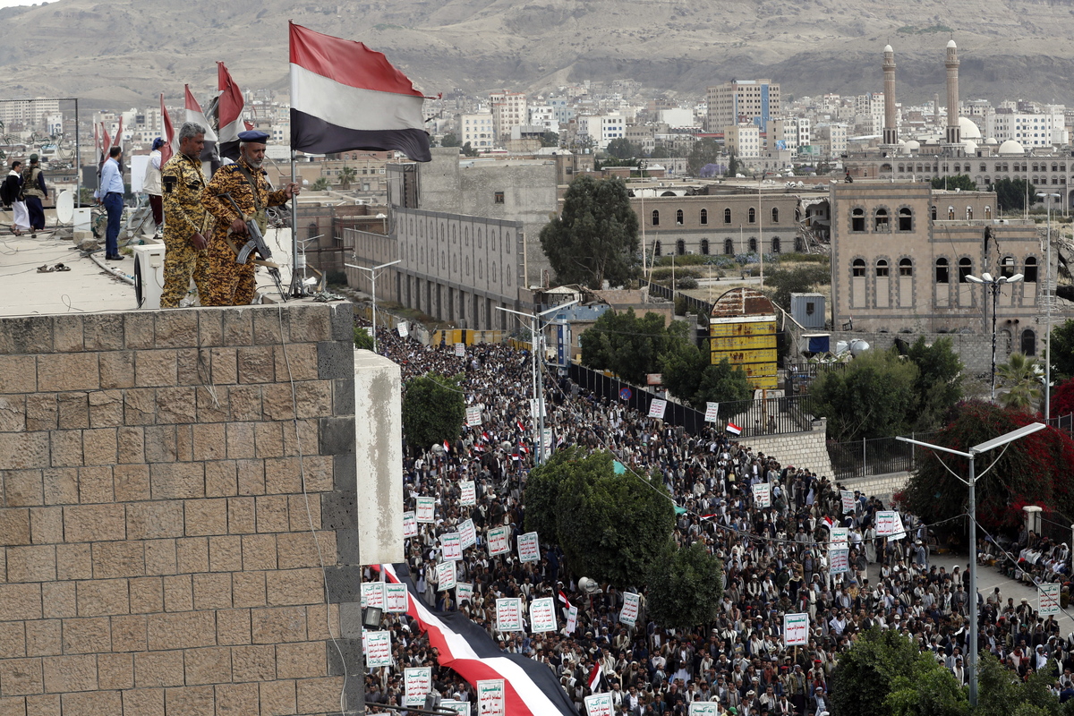 epa10544358 Houthi soldiers (L) keep watch during a protest marking the eighth anniversary of the Saudi-led military campaign on Yemen, in Sana'a, Yemen, 26 March 2023. Thousands of Houthi supporters took part in the rally. Yemen has been in the grip of a full-blown armed conflict between the Houthis and the Saudi-backed government since 26 March 2015 when the Saudi-led coalition launched a military campaign against the Houthis for restoring the government, claiming the lives of tens of thousands of people. Yemen’s war is referred to as the Saudi Arabia-Iran proxy conflict in which the warring parties have been militarily and politically backed by Saudi Arabia and Iran respectively since 2015. EPA/YAHYA ARHAB