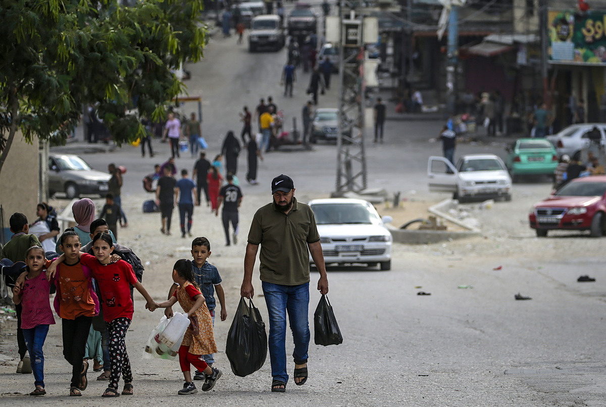 epa10922364 A Palestinian carrying food walks with his children in Al Shejaeiya neighbourhood, east of Gaza City, 16 October 2023. Israel has warned all citizens of the Gaza Strip to move to the south ahead of an expected invasion. More than 2,750 Palestinians and 1,400 Israelis have been killed according to the Israel Defense Forces (IDF) and Palestinian Health Ministry after Hamas militants launched an attack against Israel from the Gaza Strip on 07 October. EPA/MOHAMMED SABER