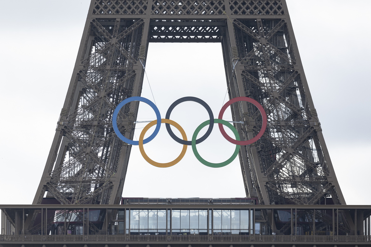 epa11417315 The Olympic Rings are attached to the landmark Eiffel Tower during the Rehearsal of the Opening Ceremony of the 2024 Paris Olympic Games on the Seine river, in Paris, France, 17 June 2024. The Olympic Games in the French capital will take place from 26 July to 11 August 2024. EPA/ANDRE PAIN