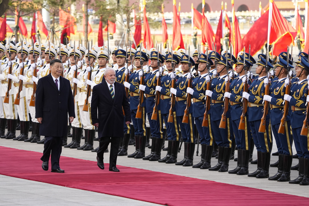 epa10572664 Brazilian President Luiz Inacio Lula da Silva (R) inspects an honor guard with Chinese President Xi Jinping (L) during a welcome ceremony held outside the Great Hall of the People in Beijing, China, 14 April 2023. EPA/KEN ISHII / POOL