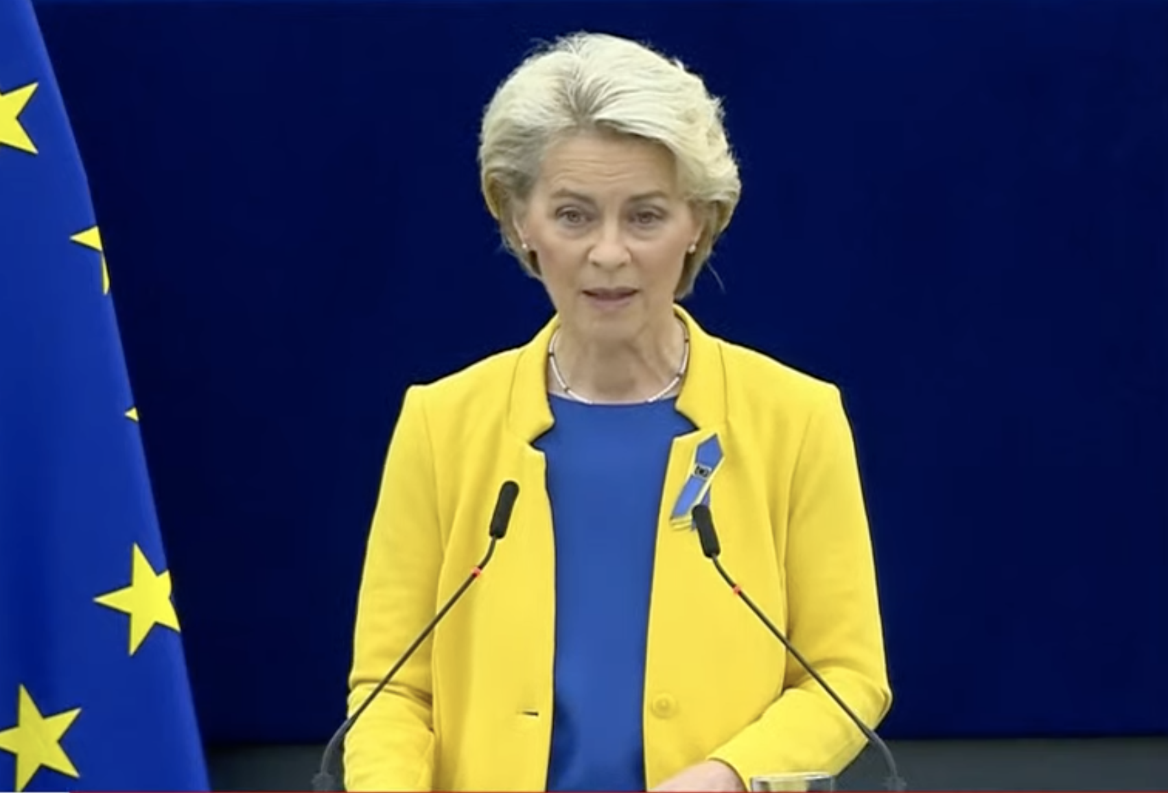 Αναφερόμενη στην Ρωσία η πρόεδρος της Κομισιόν είπε πως, «Η οικονομία της έχει πληγεί και η βιομηχανία της είναι σε διάλυση. Το Κρεμλίνο έφερε την οικονομική καταστροφή. Ο Πούτιν είναι υπεύθυνος γι’ αυτή. Θέλω να το ξεκαθαρίσω: Οι κυρώσεις μας στη Ρωσία θα παραμείνουν. Αυτό είναι ξεκάθαρο. Το ίδιο ισχύει και για την οικονομική μας υποστήριξη προς την Ουκρανία. θα έπρεπε να έχουμε ακούσει όσους γνωρίζουν τον Πούτιν. Όλους τους Ρώσους δημοσιογράφους που είχαν εκθέσει τα εγκλήματά του, αλλά εκδιώχτηκαν από αυτόν».