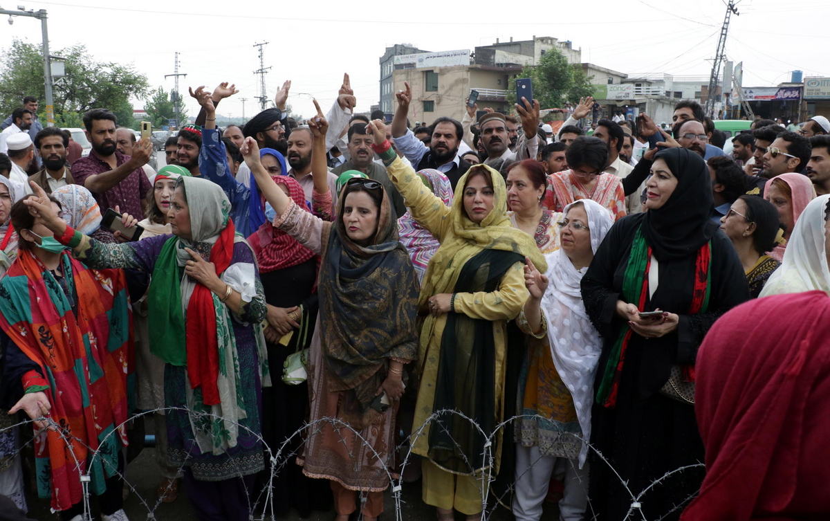 epa10137462 Supporters of Imran Khan, head of opposition political party Pakistan Tehrik-e-Insaf and former PM, gather outside a court where Khan arrived to plead pre-arrest bail in a terrorism case in Islamabad, Pakistan, 25 August 2022. A Pakistani court granted former prime minister Imran Khan a temporary respite in an alleged terrorism-related case over his controversial remarks against police and a female judge with legal proceedings over alleged custodial torture of his party colleague Shahbaz Gill. EPA/SOHAIL SHAHZAD