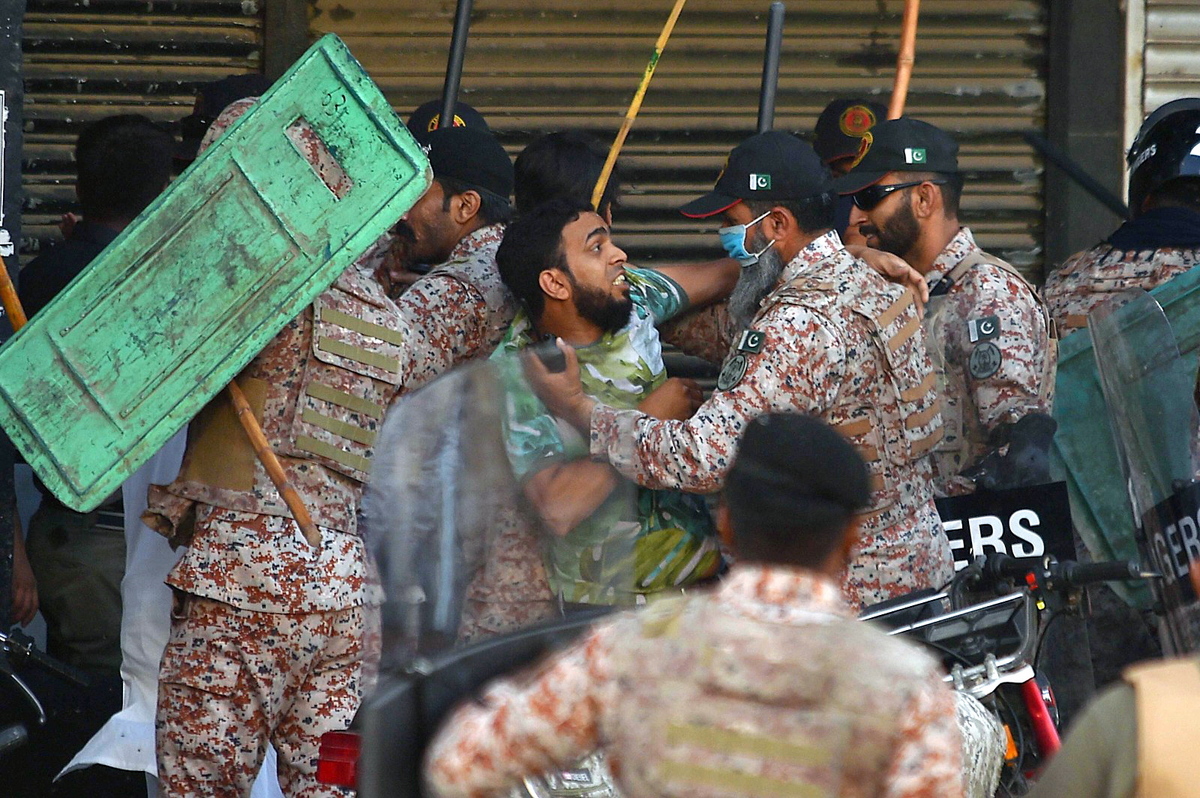 epa10619363 Supporters of former Prime Minister and head of opposition party Pakistan Tehrik-e-Insaf, Imran Khan, clash with security forces after violent protests broke out across the country following Khan's arrest, in Karachi, Pakistan, 10 May 2023. At least four people died and dozens more were injured on 09 May in disturbances across Pakistan following the arrest of former prime minister Khan, spokesperson for his PTI party said. The government shut down Twitter, Facebook, and YouTube in much of the country, blocking both the internet and mobile data. Authorities suspended the right of assembly in the capital Islamabad and throughout Khan's native province of Punjab. Pakistan Rangers, a paramilitary law enforcement corps, on 09 May apprehended former Prime Minister, Imran Khan, while he was attending a bail hearing in court in Islamabad. Khan, who had been ousted from his position as prime minister by parliament in a vote of no-confidence, is currently facing multiple charges of corruption and terrorism. EPA/SHAHZAIB AKBER