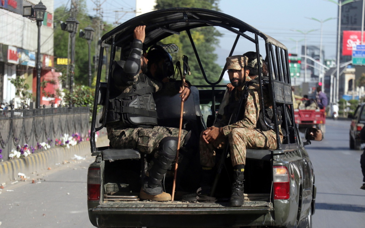 epa10618677 Pakistani security officials stand guard outside the Pakistani Army headquarters a day after violent protests broke out across the country following the arrest of Imran Khan, former prime minister and head of the opposition party Pakistan Tehrik-e-Insaf, in Rawalpindi, Pakistan, 10 May 2023. At least four people died and dozens more were injured on 09 May in disturbances across Pakistan following the arrest of former prime minister Khan, spokespeople for his PTI party said. The government shut down Twitter, Facebook, and YouTube in much of the country, blocking both the internet and mobile data. Authorities suspended the right of assembly in the capital Islamabad and throughout Khan's native province of Punjab. Pakistan Rangers, a paramilitary law enforcement corps, on 09 May apprehended former Prime Minister, Imran Khan, while he was attending a bail hearing in court in Islamabad. Khan, who had been ousted from his position as prime minister by parliament in a vote of no-confidence, is currently facing multiple charges of corruption and terrorism. EPA/SOHAIL SHAHZAD