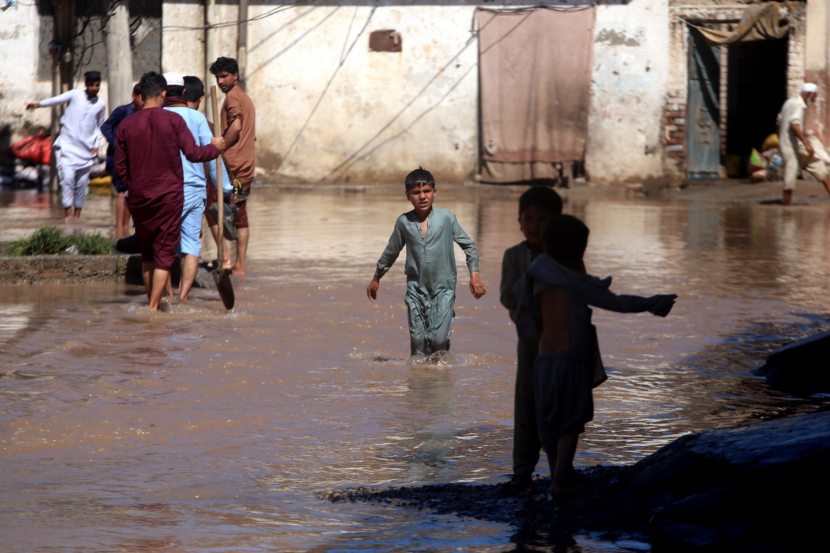 epa11282110 People wade through a flooded street after heavy rain in Charsadda District, Khyber Pakhtunkhwa province, Pakistan, 16 April 2024. Pakistan's southwest region has been in the grip of heavy rainfall for days, with at least 39 people reported dead. Among the victims were farmers struck by lightning while working in wheat fields, according to authorities. According to the Khyber Pakhtunkhwa (KP) provincial disaster management authority, 32 others have been injured in the last four days due to lightning strikes and incidents related to torrential rains affecting several provinces. Pakistan is among the world's top 10 countries most-affected by climate change. EPA/BILAWAL ARBAB