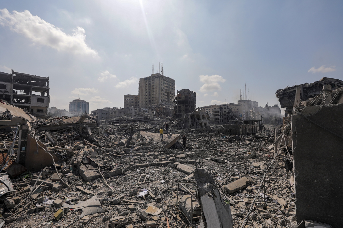 epa10911299 Palestinians walk among the rubble in the destroyed Al-Ramal neigbourhood following an Israeli air strike in Gaza City, 10 October 2023. More than 700 people have been killed and around 4,000 have been injured according to the Palestinian Ministry of Health, after Israel started bombing the Palestinian enclave in response to an attack carried out by the Islamist movement Hamas on 07 October. More than 3,000 people, including 1,500 militants from Hamas, have been killed and thousands injured in Gaza and Israel since 07 October, according to Israeli military sources and Palestinian officials. EPA/MOHAMMED SABER