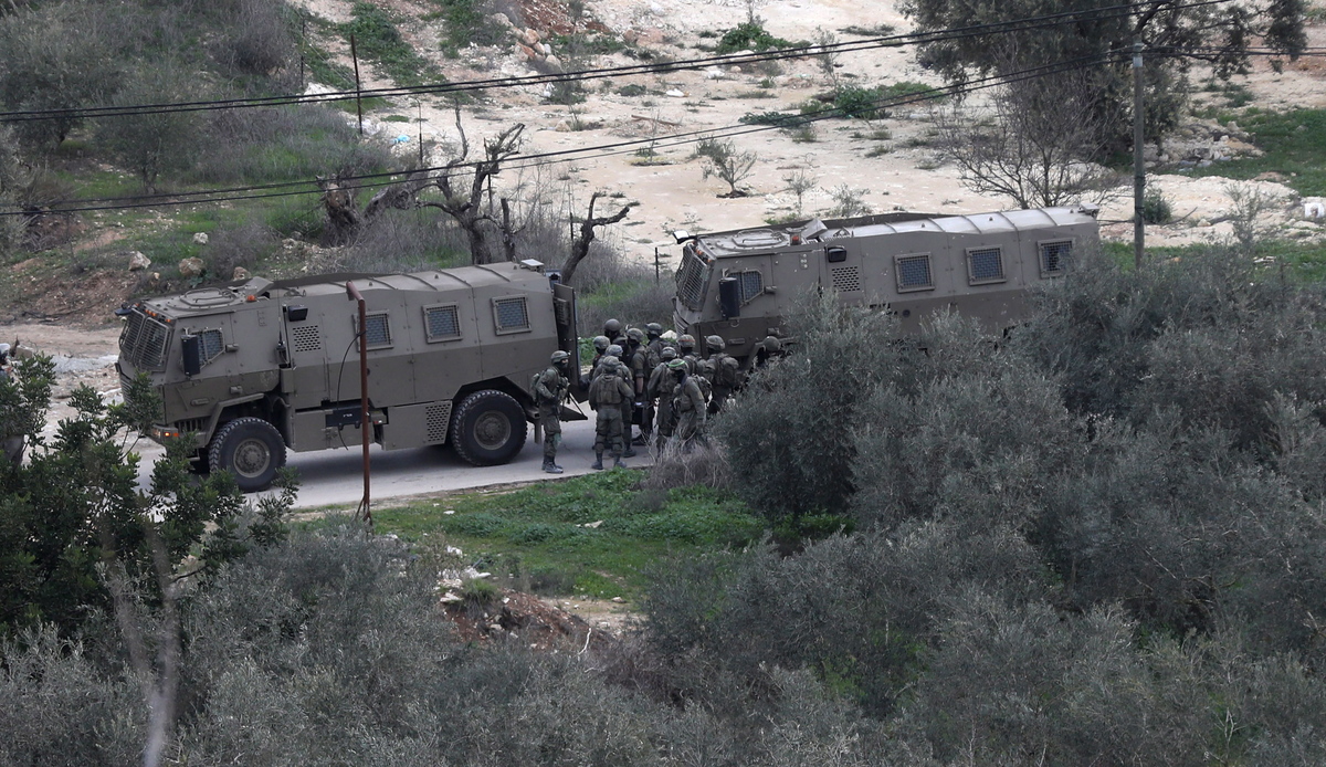 epa10386226 Israeli soldiers take positions during operation to demolish homes belonging to Palestinians accused of killing an Israeli soldier, in the West Bank village of Kafr Dan, near Jenin city, 02 January 2023. The Israeli army said Israeli forces came under attack as they entered the Kafr Dan village to demolish houses of two Palestinians accused of shooting and killing Major Bar Falah in September 2022. The Palestinian Ministry of Health said two Palestinians were killed during the Israeli raid identified as 22-year-old Muhammad Houshiyeh and 25-year-old Fouad Abed. EPA/ALAA BADARNEH 4605