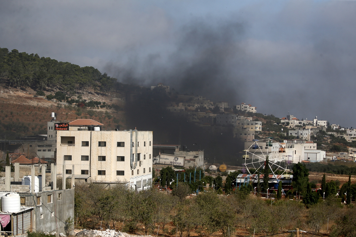 epa10832955 Smoke rises from a building during an Israeli army raid on the village of Aqaba, near the city of Tubas, in the northeastern West Bank, 01 September 2023. The Israeli army on the morning of 01 September raided the Aqaba village and fired rockets at a building while they tried to arrest a wanted militant. According to the Palestinian Health Ministry on 01 September, one 36-year-old Palestinian died from gunshots related injury sustained in the raid and ensuing clashes. EPA/ALAA BADARNEH
