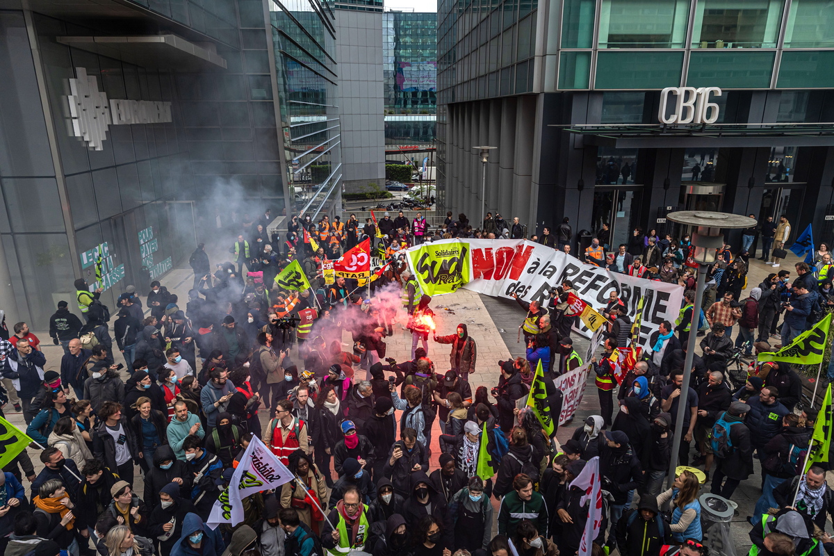 Με κεντρικό σύνθημα «είμαστε εδώ, είμαστε εδώ, ακόμα και αν ο Μακρόν δεν το θέλει είμαστε εδώ», τουλάχιστον 300 διαδηλωτές εισέβαλαν στην εταιρεία Euronext με σημαίες και φωτοβολίδες για να διαδηλώσουν για το αύξηση των ορίων συνταξιοδότησης, από τα 62 στα 64 έτη.