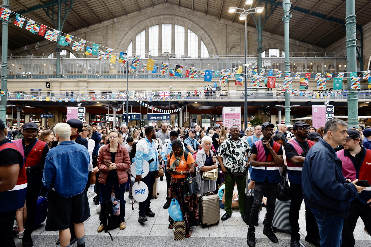 epa11496929 Stranded passengers wait inside Gare du Nord station in Paris, France, 26 July 2024. France's high speed rail network TGV was severely disrupted on 26 July following a 'massive attack', according to train operator SNCF, just hours before the opening ceremony of the Paris 2024 Olympic games. French Transport Minister Patrice Vergriete condemned 'these criminal actions' saying that they would 'seriously disrupt traffic' until this weekend. Around 800,000 passengers are expected to be affected over the weekend. EPA/RITCHIE B. TONGO