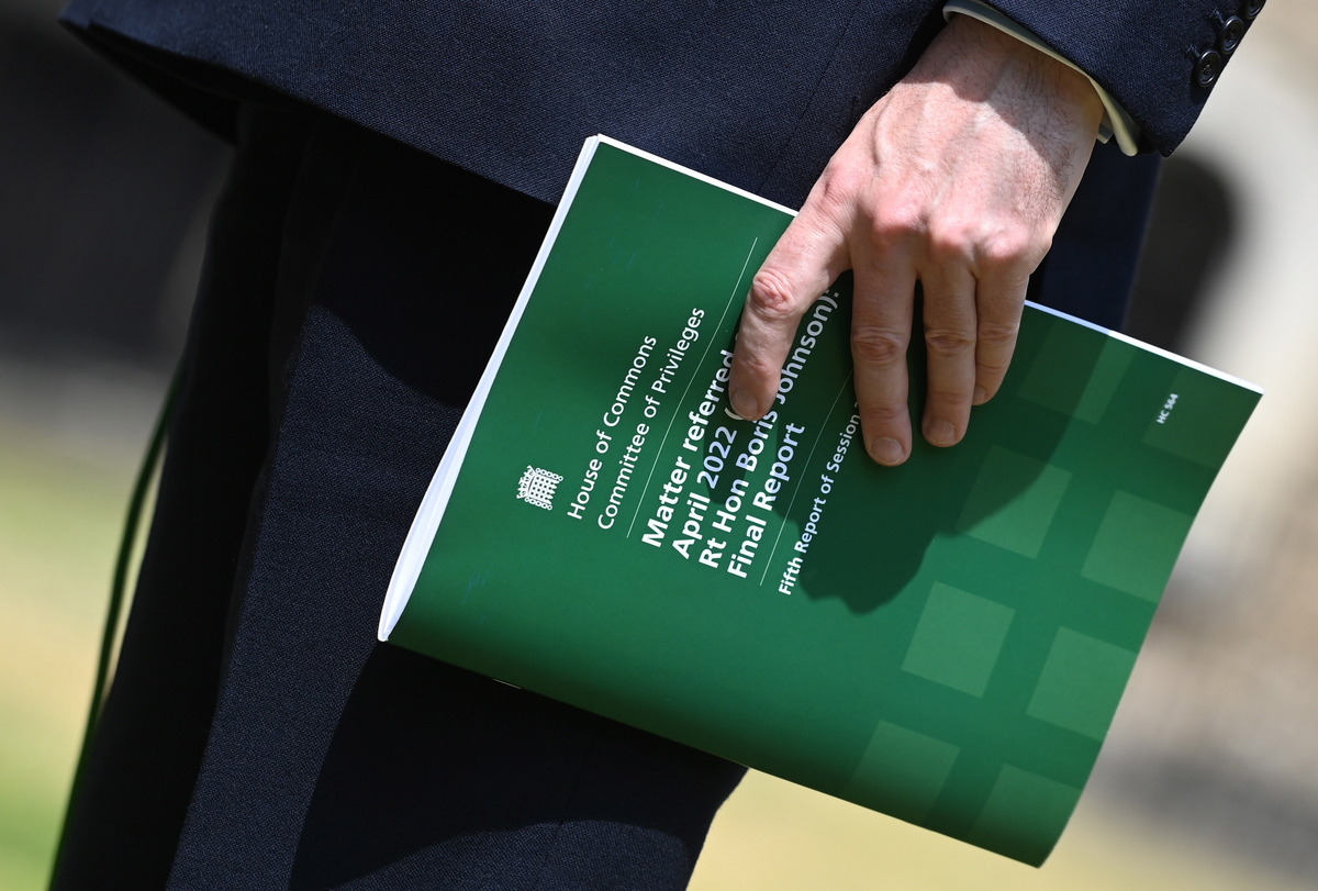 epa10692309 A House of Commons Committee of Privileges report into the conduct of former Prime Minister Boris Johnson outside the Houses of Parliament in London, Britain, 15 June 2023. A report from MPs has shown former British Prime Minster Boris Johnson deliberately misled Parliament over parties at 10 Downing Street during the COVID-19 lockdown. Boris Johnson stood down as an MP ahead of the Privileges Committee's report, claiming he was 'forced out of Parliament'. If he was still an MP, the report would recommend a suspension of 90 days. EPA/NEIL HALL