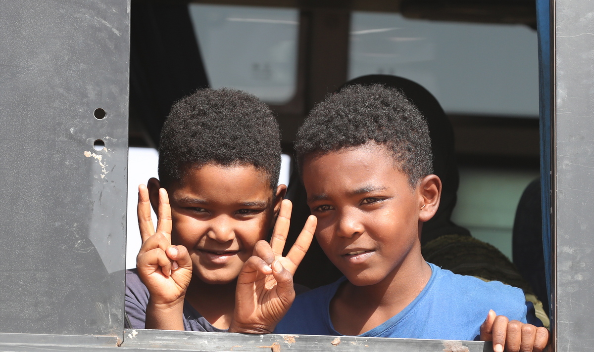 epa10633262 Sudanese children flash the V sign from a bus on a Nile ferry after crossing the border from Sudan, Abu Simbel, southern Egypt, 17 May 2023. According to the UNHCR office, 83,758 Sudanese have crossed into Egypt since the beginning of an armed conflict on 15 April between the Sudanese military and the RSF (Rapid Support Forces) militia. The UN estimates some 200,000 people have fled Sudan since the conflict erupted. EPA/KHALED ELFIQI