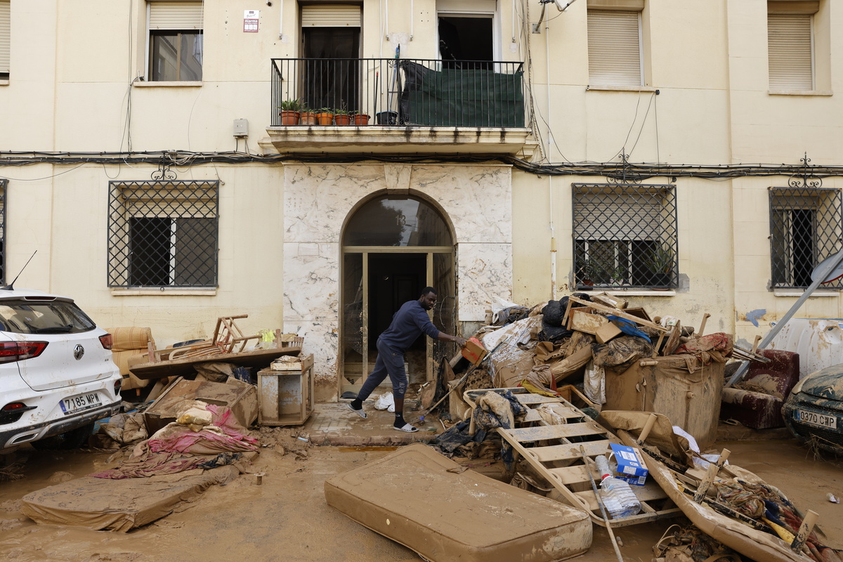 epa11695648 People affected by floods in Valencia's La Torre neighborhood clean their homes, in Valencia, 01 November 2024. More than 150 people have died in Valencia and neighboring provinces after floods caused by a DANA (high-altitude isolated depression) weather phenomenon hit the east of the country. According to Spain's national weather agency (AEMET), on 29 October 2024 Valencia received a year's worth of rain, causing flash floods that destroyed homes and swept away vehicles. EPA/ANA ESCOBAR