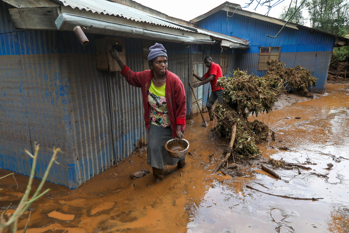 epa11308907 Local residents clear mud off their house after Old Kijabe Dam burst its banks and caused flash floods through several villages in Mai Mahiu, in the Rift Valley region of Naivasha, Kenya, 29 April 2024. The flash floods left behind a trail of damaged houses that got swept away, claiming 42 death so far as search and rescue mission continues, according to Kenya Red Cross Society. Kenya and the wider East African region continue to experience flooding due to the ongoing heavy rainfall. EPA/DANIEL IRUNGU