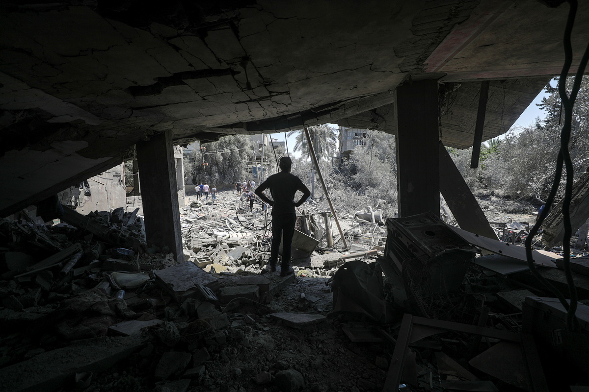 epaselect epa11467994 A Palestinian man inspects the rubble of a destroyed building following an Israeli air strike in Al Nuseirat refugee camp, central Gaza Strip, 09 July 2024. More than 16 Palestinians have been killed following Israeli air strikes in Al Nuseirat refugee camp on 09 July, according to the Palestinian Ministry of Health. The Israeli military stated that its troops are continuing 'operational activity' throughout the Gaza Strip. More than 38,000 Palestinians and over 1,455 Israelis have been killed, according to the Palestinian Health Ministry and the IDF, since Hamas militants launched an attack against Israel from the Gaza Strip on 07 October 2023, and the Israeli operations in Gaza and the West Bank which followed it. EPA/MOHAMMED SABER