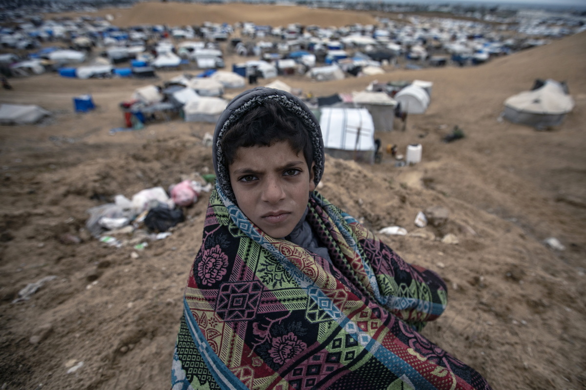 epa11738461 A child poses for a photo near tents of internally displaced Palestinians on a cloudy day in Khan Younis, southern Gaza Strip, 24 November 2024. According to the UN, at least 1.9 million people (or nine in ten people) across the Gaza Strip are internally displaced, including people who have been repeatedly displaced. Since October 2023, only about 11 percent of the Gaza Strip has not been placed under Israeli-issued evacuation orders, the UN aid coordination office OCHA said. EPA/HAITHAM IMAD