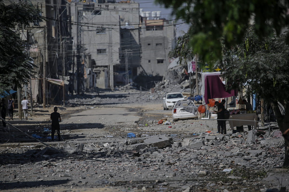 epa11490868 Palestinians walk among the rubble following an Israeli airstrike in the Al Nusairat refugee camp, central Gaza Strip, 21 July 2024. More than 38,000 Palestinians and over 1,400 Israelis have been killed, according to the Palestinian Health Ministry and the Israel Defense Forces (IDF), since Hamas militants launched an attack against Israel from the Gaza Strip on 07 October 2023, and the Israeli operations in Gaza and the West Bank which followed it. EPA/MOHAMMED SABER