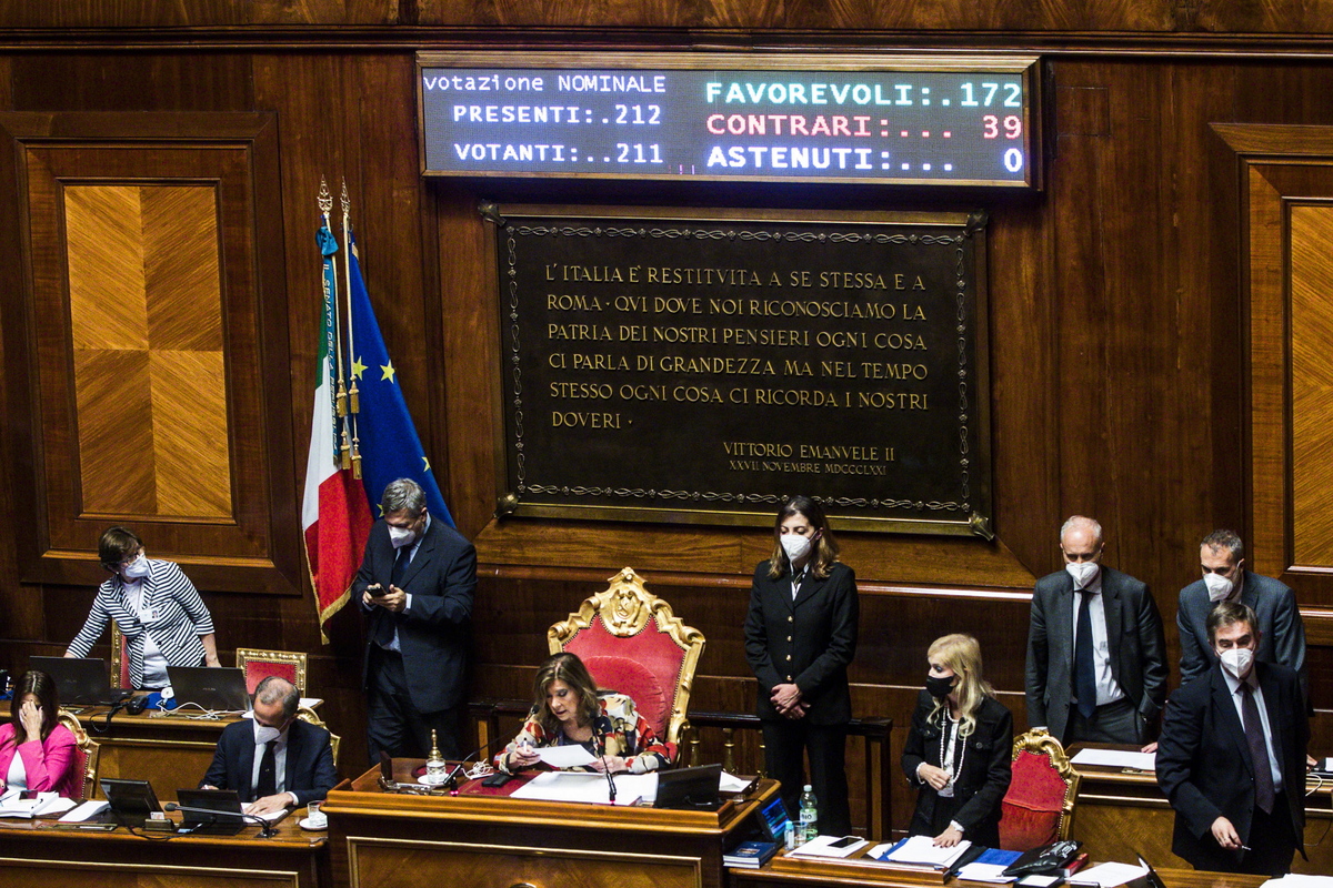 epa10070954 A view of the Senate with the result of the confidence vote, in Rome, Italy, 14 July 2022. The 5-Star Movement's Senators were absent for Thursday's confidence vote in the Upper House on the government's aid decree for the cost-of-living crisis. The decree passed with 172 votes in favour and 39 against. EPA/ANGELO CARCONI