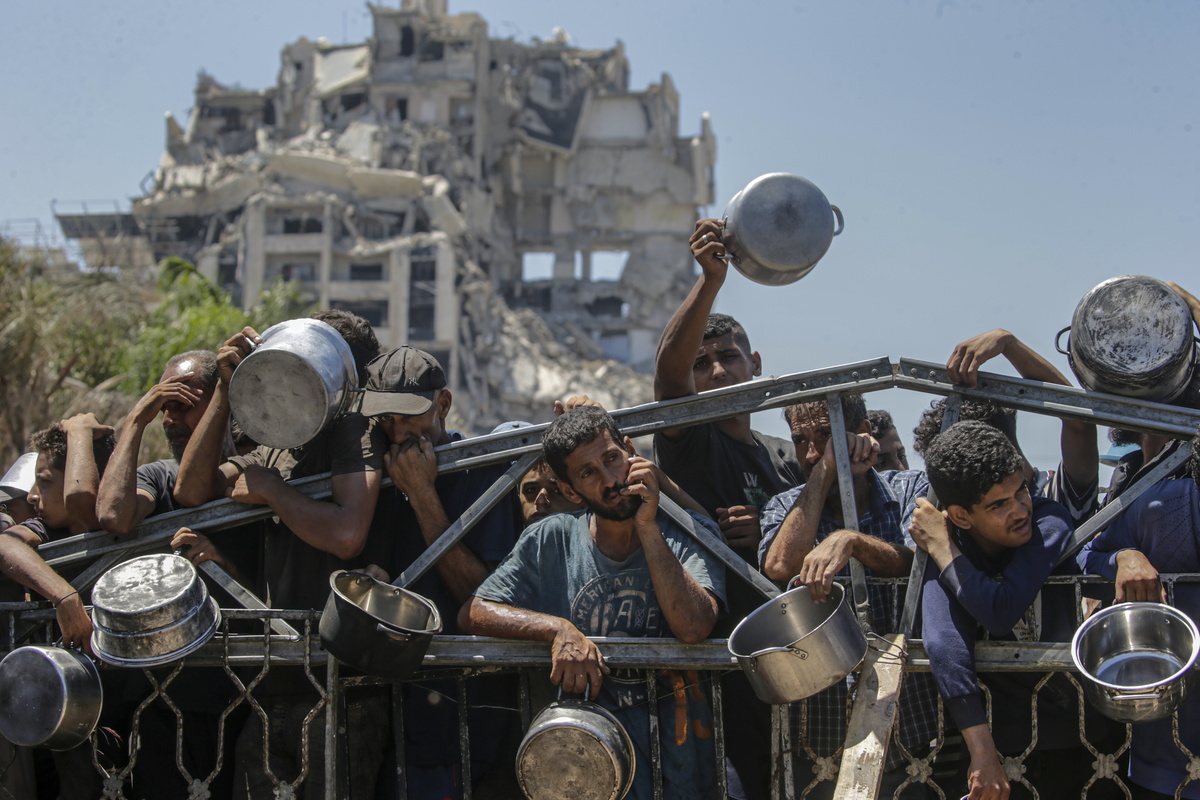 epa12282746 Internally displaced Palestinians gather to receive food from a charity kitchen, in Gaza City, Gaza Strip, 04 August 2025. Humanitarian organizations have warned of an imminent food catastrophe for thousands of children, a crisis caused by severe food insecurity, a decline in health services, and ongoing restrictions on humanitarian aid and essential supplies. EPA/MOHAMMED SABER