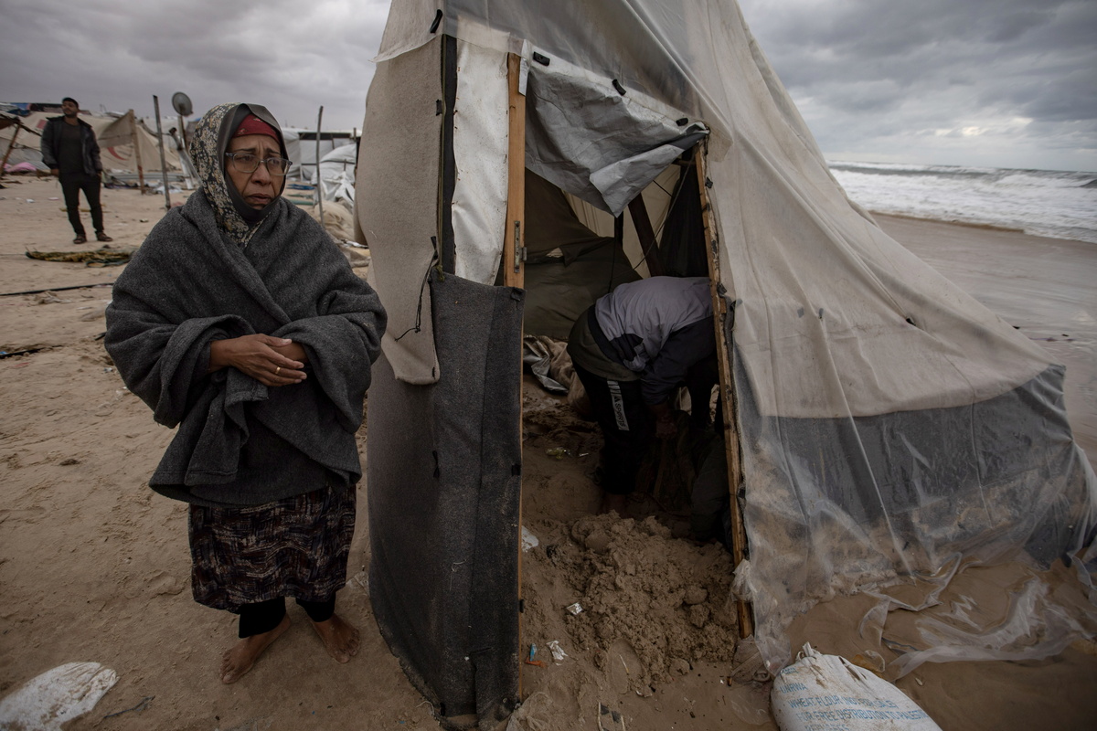 Καθισμένος στη σκηνή του ο Αϊμάν Σιάμ προσπαθεί να δημιουργήσει ένα ετερόκλιτο, μικρό προστατευτικό ανάχωμα, αναμφίβολα αναποτελεσματικό, για να διατηρήσει στεγνή την οικογένειά του καθώς αναμένονται οι βροχές του χειμώνα στη Λωρίδα της Γάζας.