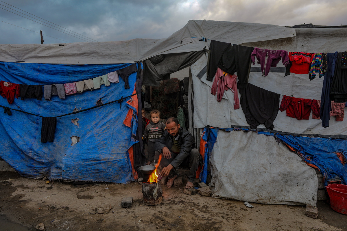 epaselect epa11740148 Internally displaced Palestinians warm next to a fire outside their tents on a windy day in Deir Al Balah, central Gaza Strip, 25 November 2024. According to the UN, at least 1.9 million people (or nine in ten people) across the Gaza Strip are internally displaced, including people who have been repeatedly displaced. Since October 2023, only about 11 percent of the Gaza Strip has not been placed under Israeli-issued evacuation orders, the UN aid coordination office OCHA said. EPA/MOHAMMED SABER
