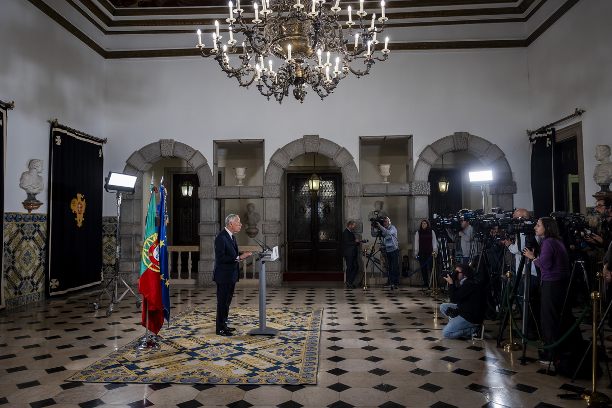 epa11962366 Portuguese President Marcelo Rebelo de Sousa (L) announces the date for the country's third general election in just over three years, following Parliament's rejection of a government motion of confidence, at Palacio de Belem in Lisbon, Portugal, 13 March 2025. The motion was presented by Portuguese Prime Minister Luis Montenegro, who faced questions regarding the activities of a consultancy firm he founded, which is now managed by his sons. EPA/JOSE SENA GOULAO