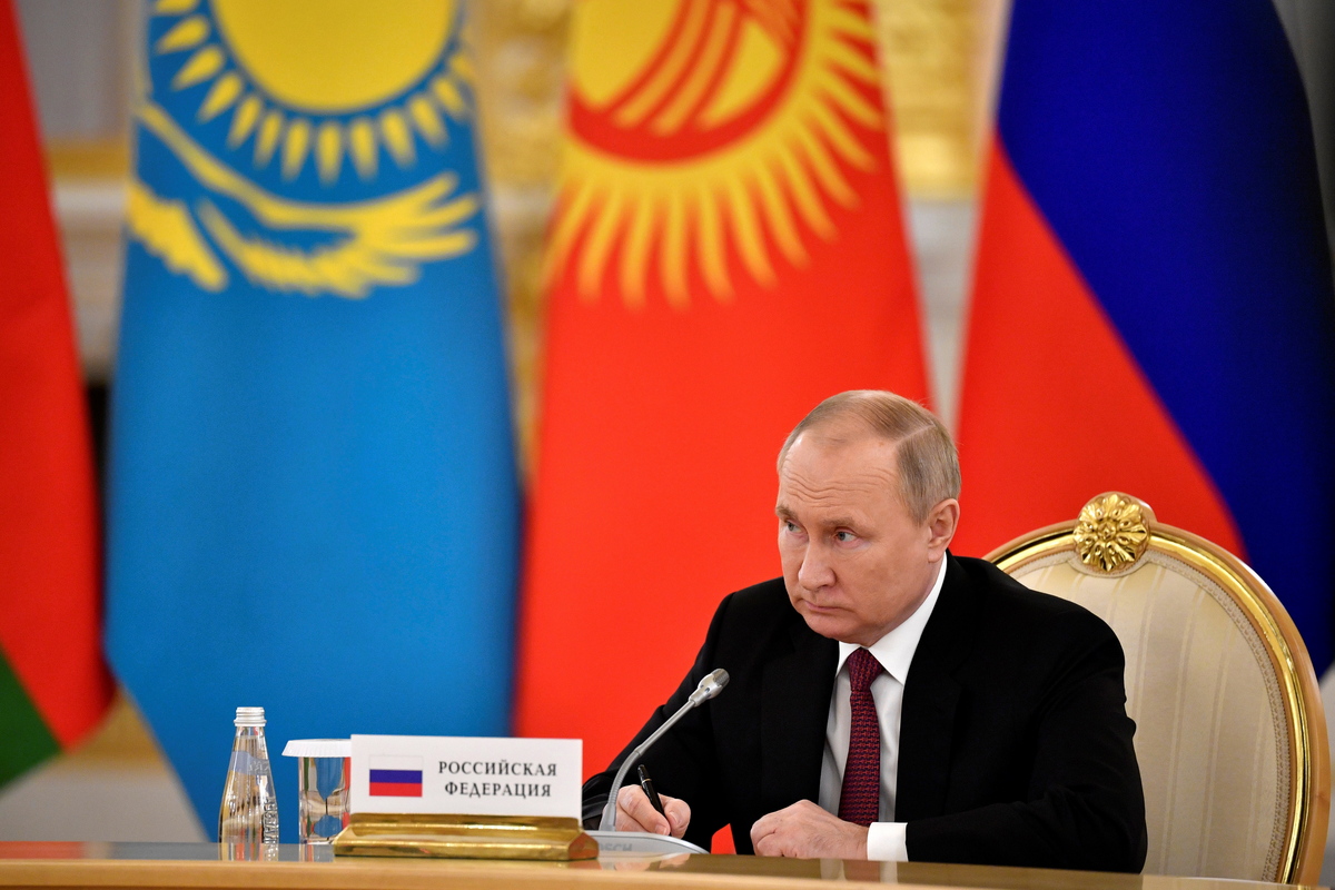 epa09950759 Russian President Vladimir Putin attends a meeting of the leaders of the Collective Security Treaty Organization (CSTO) member states at the Kremlin in Moscow, Russia, 16 May 2022. Moscow is hosting the CSTO summit, timed to coincide with the 30th anniversary of the signing of the Collective Security Treaty and the 20th anniversary of the creation of the organization, which includes Armenia, Belarus, Kazakhstan, Kyrgyzstan, Russia and Tajikistan. EPA/ALEXANDER NEMENOV / POOL