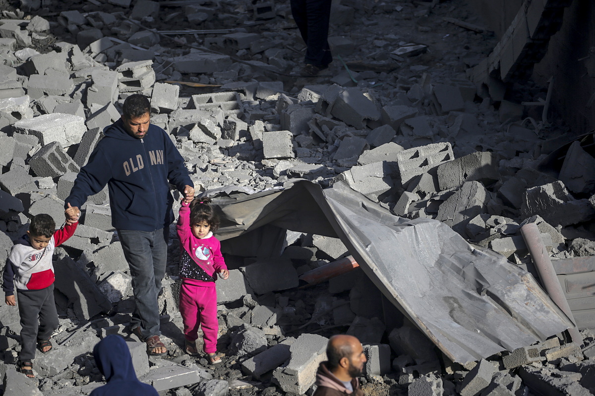 epa11198392 A Palestinian man with two children walks among the rubble of a destroyed house following Israeli air strikes in Al Nusairat refugee camp, Gaza Strip, 04 March 2024. More than 30,500 Palestinians and over 1,300 Israelis have been killed, according to the Palestinian Health Ministry and the Israel Defense Forces (IDF), since Hamas militants launched an attack against Israel from the Gaza Strip on 07 October 2023, and the Israeli operations in Gaza and the West Bank which followed it. EPA/MOHAMMED SABER