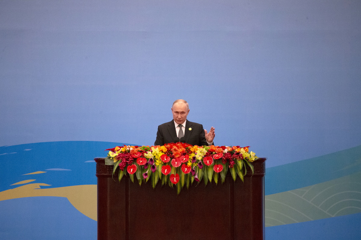 epa10924985 Russian President Vladimir Putin speaks during the opening ceremony of the Third Belt and Road Forum for International Cooperation at the Great Hall of the People in Beijing, China, 18 October 2023. EPA/ANDRES MARTINEZ CASARES
