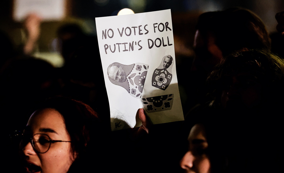 epa11744301 Romanian protesters shout slogans and hold up placards during a protest in front of government headquarters against the far-right independent presidential candidate Calin Georgescu, in Bucharest, Romania, 27 November 2024. Hundreds of students and civil rights activists gathered in the center of Romania's capital to warn against the victory of far-right independent candidate Calin Georgescu, whose declarations worried human right activists. Protests continue for a third night in a row across Romania's largest cities against Calin Georgescu, who led in the first round of the presidential race, winning 22.94 percent of the total number of votes, followed by Elena Lasconi, leader of the USR (Save Romania Union), with 19.18 percent. The second round of Romania's presidential election will be held on 08 December 2024. EPA/ROBERT GHEMENT