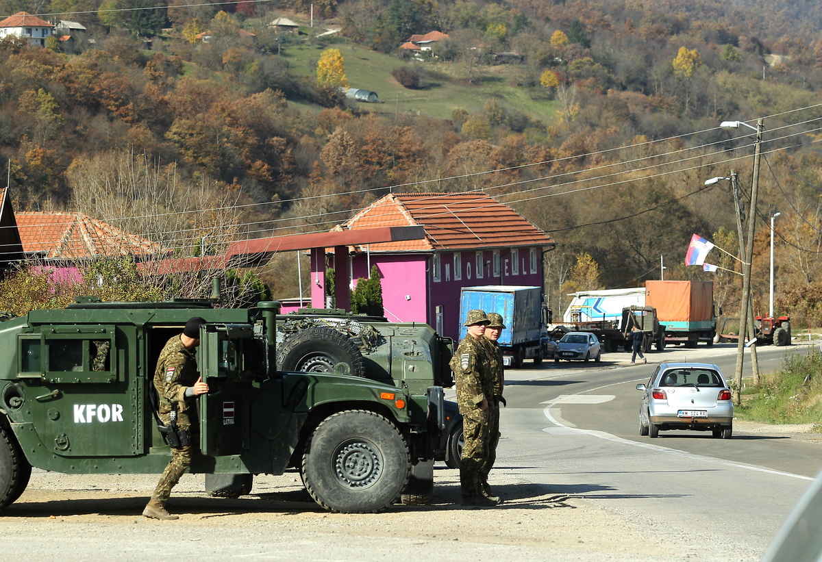 epa10279180 Members of the Latvian contingent of NATO-led international peacekeeping force in Kosovo (KFOR) observe the Jarinje border crossing between Kosovo and Serbia at Jarinje, Kosovo, 01 November 2022. The Government of Kosovo will begin implementing a plan to eliminate the usage of Serbian car license plates. All owners of vehicles with Serbian number plates are warned and requested to visit any of the Vehicle Registration Centers and register their vehicles with RKS license plates. In the Serbian community of Kosovo, the RKS license plates are seen as unacceptable as they suggest the recognition of independence of the Republic of Kosovo. EPA/DJORDJE SAVIC