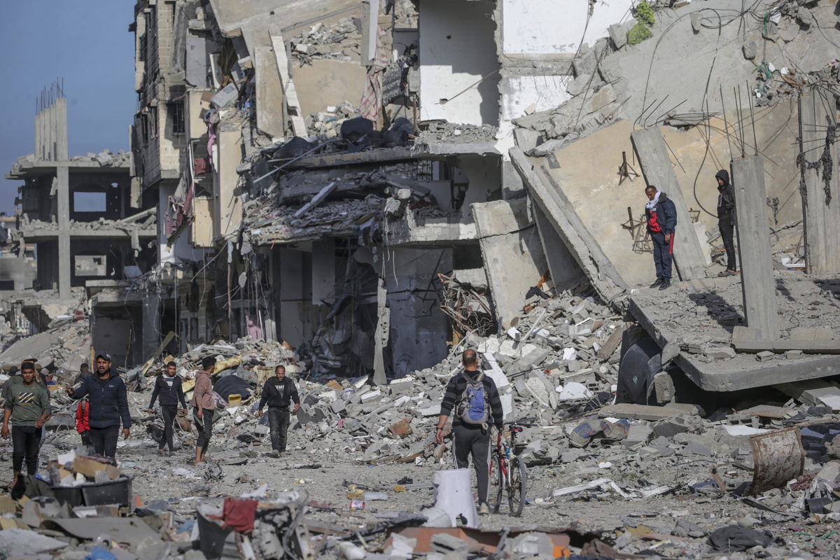 Εσωτερικά εκτοπισμένοι Παλαιστίνιοι επιστρέφουν στα κατεστραμμένα σπίτια τους στη Ράφα, στη νότια Λωρίδα της Γάζας, 19 Ιανουαρίου 2025. EPA/MOHAMMED SABER