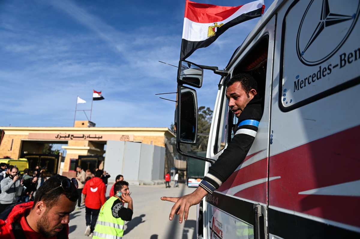 Φορτηγά με ανθρωπιστική βοήθεια διασχίζουν το συνοριακό πέρασμα της Ράφα με προορισμό τη Λωρίδα της Γάζας, 19 Ιανουαρίου 2025. EPA/MOHAMED HOSSAM
