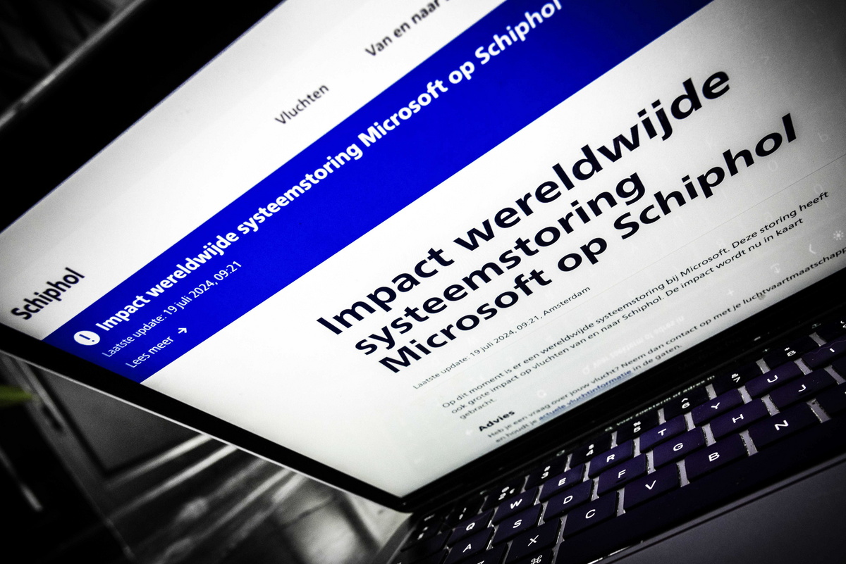 epa11487047 A laptop screen shows delays reported on the website of Schiphol Airport, in the Netherlands, 19 July 2024. According to the airport's spokesperson, the IT outage has an impact on flights flying from and to Schiphol. Several airports and airlines have reported issues with their IT systems on 19 July, due to a global IT outage. EPA/ROB ENGELAAR