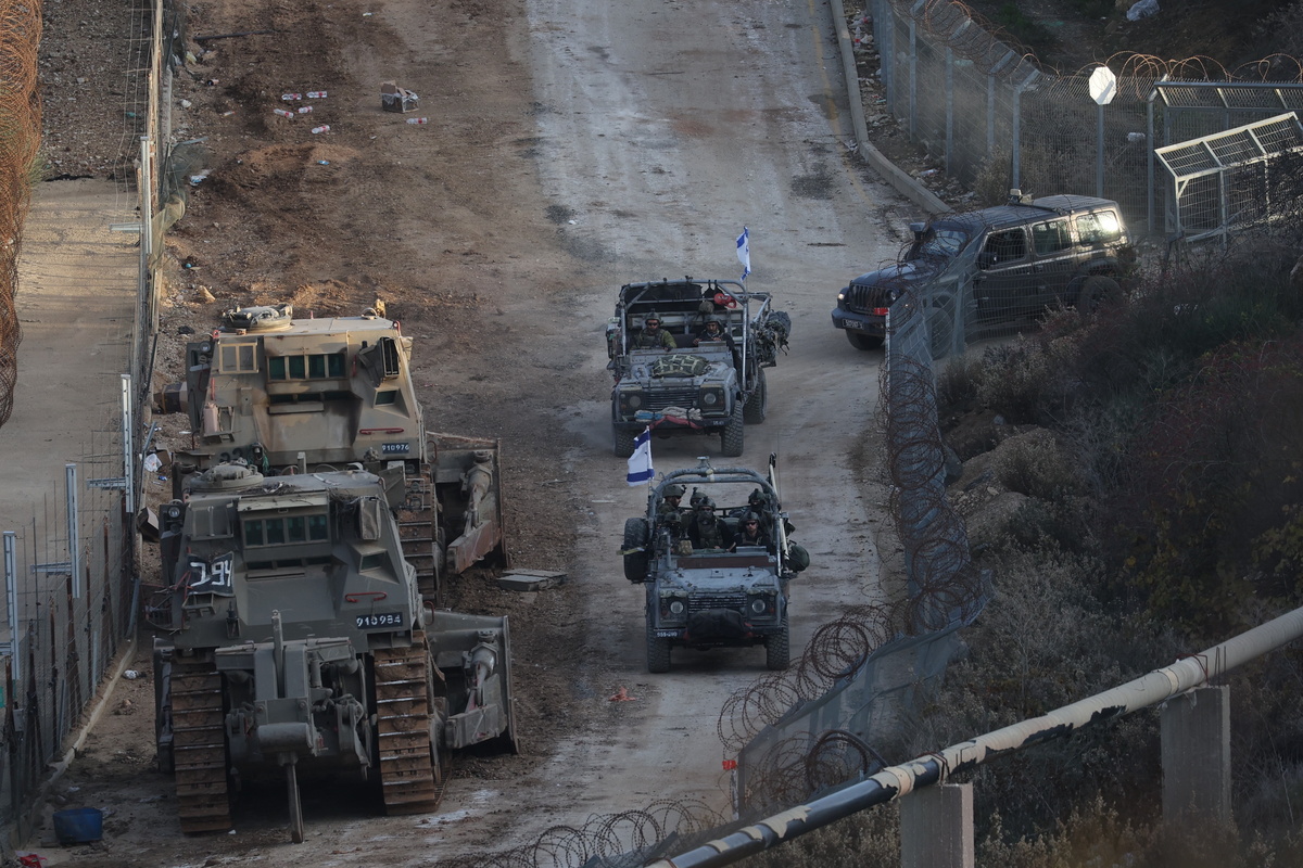 epa11766703 Israeli troops at the border with Syria near the Druze village of Majdal Shams, in the Israeli-annexed Golan Heights, 09 December 2024. The Israeli army announced it has deployed forces to strengthen the defense of the Golan Heights and the eastern Israeli border with Syria. Syrian rebels entered Damascus on 08 December 2024 and announced in a televised statement the 'Liberation of the city of Damascus and the overthrow of Bashar al-Assad', as well as the release of all the prisoners EPA/ABIR SULTAN