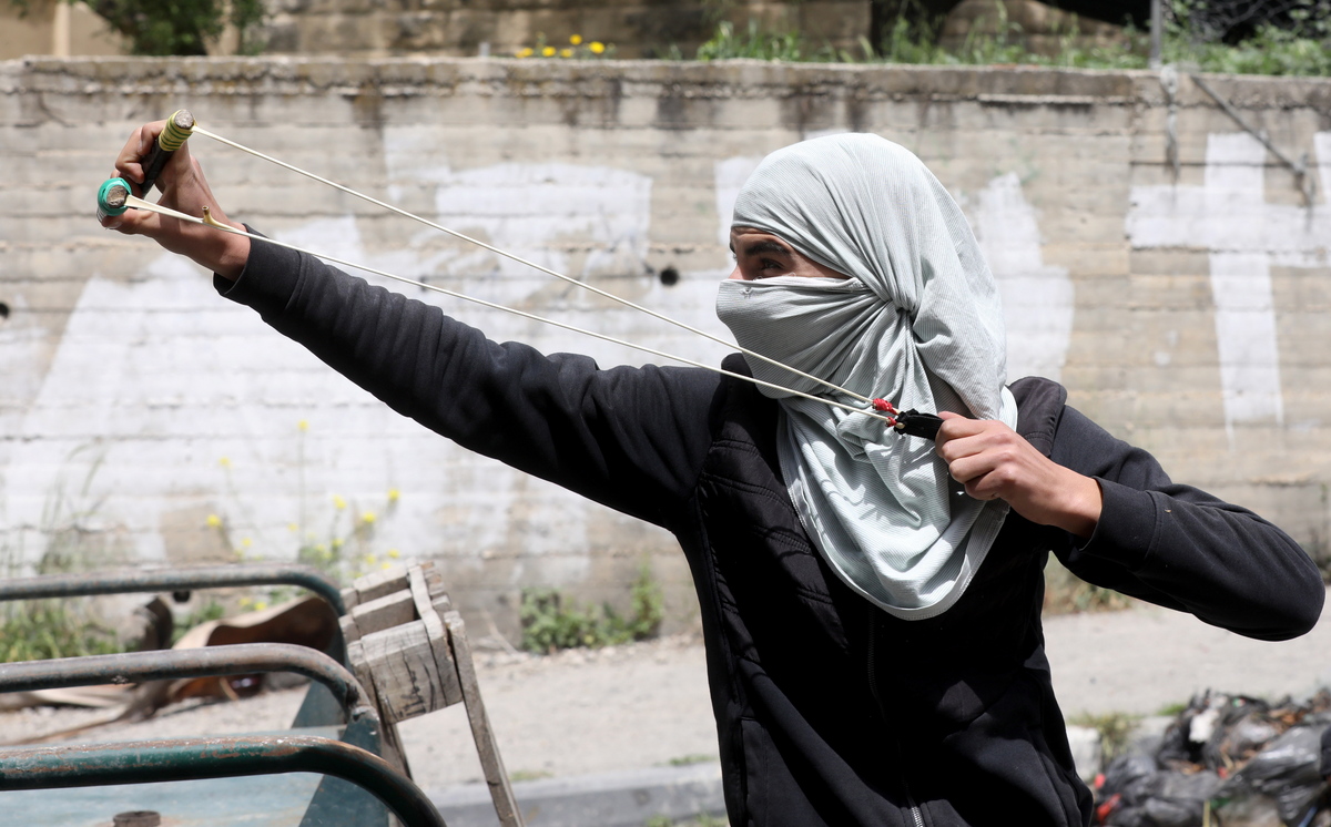 epa09897142 Palestinians throw rocks during clashes with Israeli soldiers at Burqa village near the West Bank city of Nablus, 19 April 2022. Clashes erupted after thousands of Israeli settlers took part in a march to the evacuated Homesh settlement and arrived to protest near the village. EPA/ALAA BADARNEH