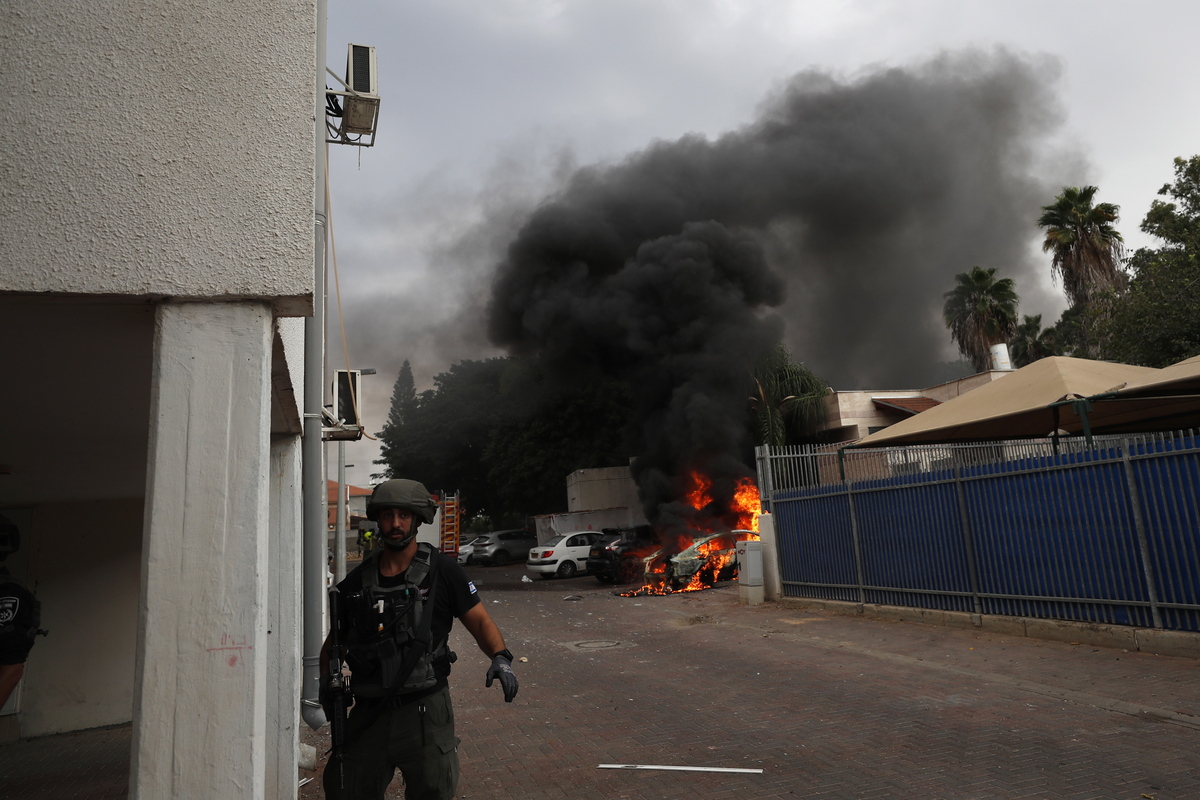 epa10909949 Smoke billows after a missile launched from Gaza hit a car in Sderot, near the border with Gaza, southern Israel, 09 October 2023. Israeli chief military spokesperson Rear-Admiral Daniel Hagari said on 09 October that the country had drafted a record of 300,000 reservists. More than 700 Israelis were killed and over 2,000 were injured since the Islamist movement Hamas carried out an unprecedented attack on southern Israel on 07 October, the Israeli army said. According to Palestinian officials, more than 500 people were killed and nearly 3,000 were injured as a result of Israel’s retaliatory raids and air strikes in the Palestinian enclave. EPA/ATEF SAFADI