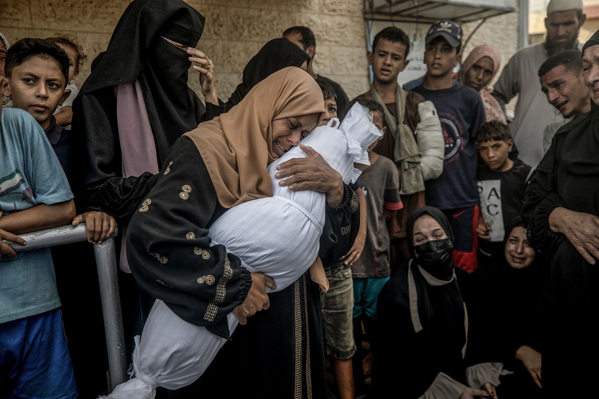 epaselect epa11635052 A woman reacts while holding the body of one of the late Al Dera family members during their funeral following an Israeli air strike in Al Nusairat refugee camp, central Gaza Strip, 01 October 2024. According to the Ministry of Health in Gaza, at least eight members of the family were killed in an Israeli airstrike earlier in the day. More than 41,000 Palestinians and over 1,400 Israelis have been killed, according to the Palestinian Health Ministry and the Israel Defense Forces (IDF), since Hamas militants launched an attack against Israel from the Gaza Strip on 07 October 2023, and the Israeli operations in Gaza and the West Bank which followed it. EPA/MOHAMMED SABER