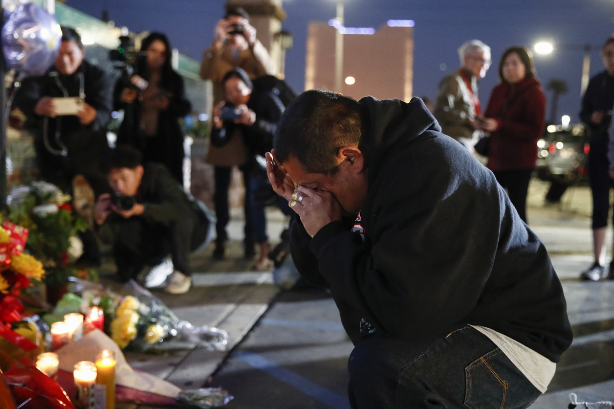 epaselect epa10425873 A person kneels down in front of a makeshift memorial outside of Star Dance Studio in Monterey Park, California, USA, 23 January 2023. A 72-year-old man of Asian descent shot and killed 10 people as they celebrated the Lunar New Year at Star Dance Studio on 21 January 2023. EPA/CAROLINE BREHMAN