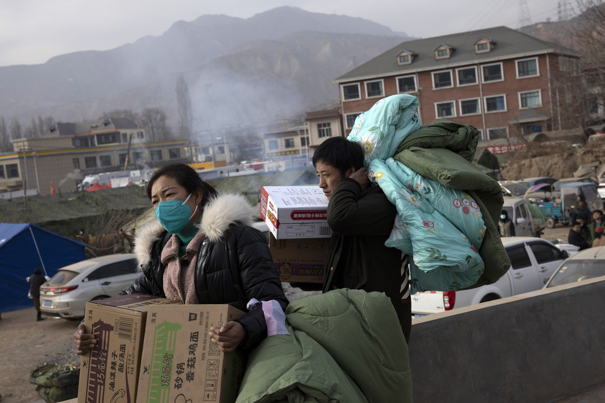 epa11038450 Residents carry aid after the earthquake, during a media tour in Dahejia, in Gansu Province, China, 20 December 2023. Over 100 people died after a 6.2-magnitude earthquake jolted China's Gansu Province on late December 18. EPA/ANDRES MARTINEZ CASARES