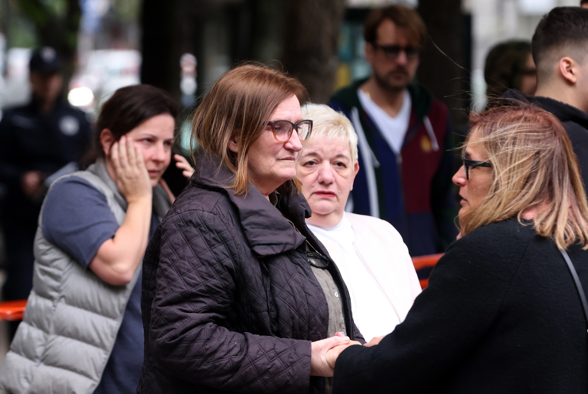 epa10606243 Women react near the 'Vladislav Ribnikar' elementary school in Belgrade, Serbia, 03 May 2023. A teenage suspect opened fire causing one fatality and multiple injuries according to Serbia's Interior ministry. EPA/ANDREJ CUKIC