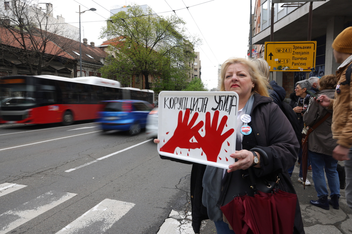 epa12033005 A woman holds a banner reading 'Corruption Kills' to passing motorists during the university student-led blockade of the headquarters of Serbia's public broadcaster, Radio Television of Serbia (RTS), in Belgrade, Serbia, 15 April 2025. University students staged a protest demanding accountability after sixteen people lost their lives in the collapse of the Novi Sad Railway Station canopy on 1 November 2024. The station building, which had been renovated and reopened on 5 July 2024, was undergoing further renovations shortly before the collapse. EPA/ANDREJ CUKIC