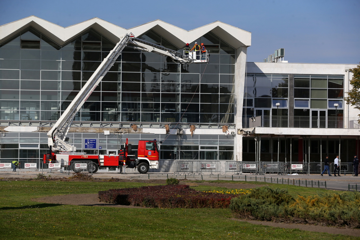 epa11697130 Emergency services examine the site following the collapse of the canopy at the railway station in Novi Sad, Serbia, 02 November 2024. Fourteen people lost their lives in the collapse of the Novi Sad Railway Station canopy that occurred on 01 November, as stated by Interior Minister Ivica Dacic. The mayor of Novi Sad, Milan Djuric, reported over 30 injuries in the incident, which occurred just before noon. The recently renovated station building, reopened on 05 July 2024, was undergoing another renovation shortly before the collapse. EPA/ANDREJ CUKIC