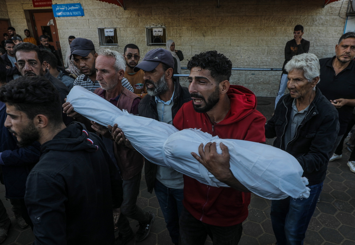 epa11690142 The father of two children, brothers aged one and eleven, mourns as he carries one of the bodies during their funeral at Al Aqsa Martyrs hospital in Deir Al Balah town, central Gaza Strip, 29 October 2024. According to the Palestinian Ministry of Health in Gaza, at least 10 Palestinians were killed in an Israeli airstrike in the Al Zawaida neighborhood overnight. More than 43,000 Palestinians, including over 13,000 children, have been killed according to the Palestinian Ministry of Health and over 1,400 Israelis have been killed according to the Israel Defense Forces (IDF), since Hamas militants launched an attack against Israel from the Gaza Strip on 07 October 2023, and the Israeli operations in Gaza and the West Bank which followed it. EPA/MOHAMMED SABER ATTENTION EDITORS: GRAPHIC CONTENT