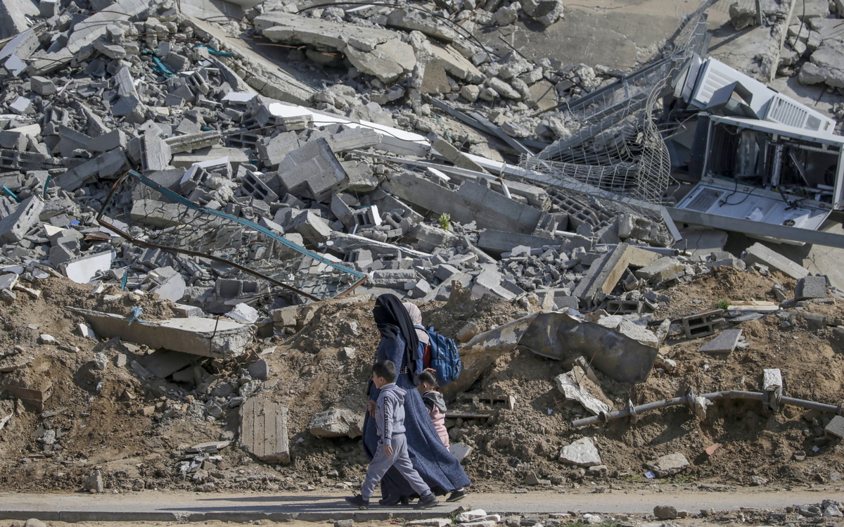 epa11186904 A Palestinian mother walks with her children next to the rubble of a destroyed residential building in Al Nuseirat refugee camp, central Gaza Strip, 28 February 2024, following Israeli air strikes. More than 29,900 Palestinians and over 1,300 Israelis have been killed, according to the Palestinian Health Ministry and the Israel Defense Forces (IDF), since Hamas militants launched an attack against Israel from the Gaza Strip on 07 October 2023, and the Israeli operations in Gaza and the West Bank which followed it. EPA/MOHAMMED SABER
