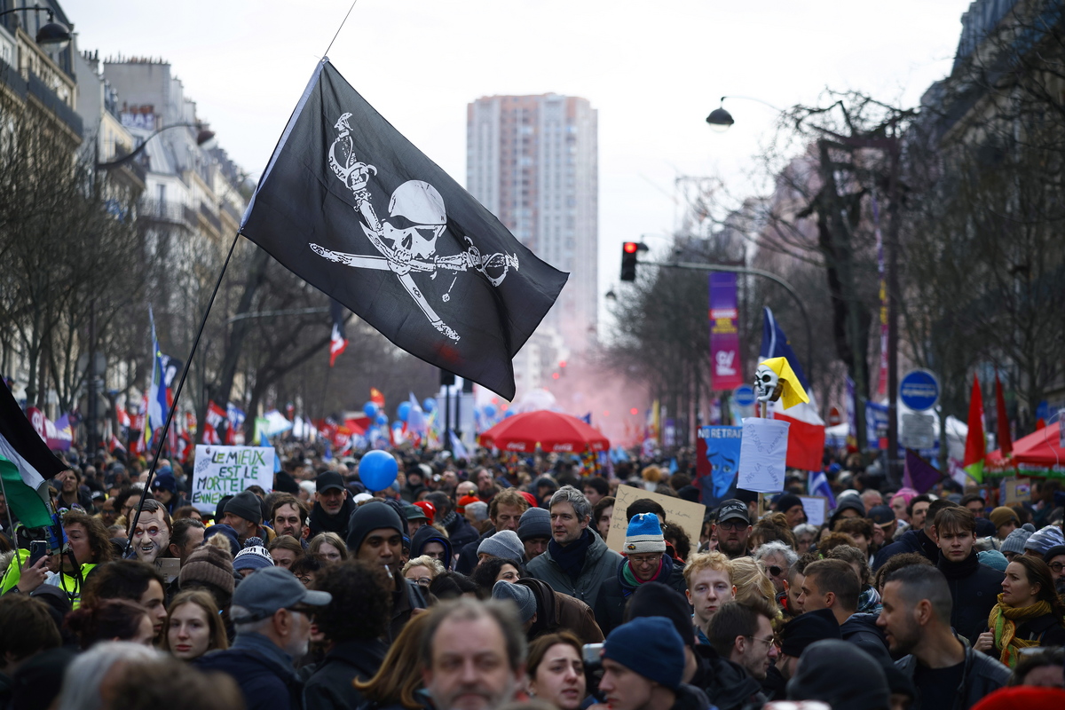 epa10441254 People take part in a rally against the French government's planned reform of the pension system, in Paris, France, 31 January 2023. The French government plans to delay the minimum retirement age from 62 to 64 by 2030. EPA/YOAN VALAT
