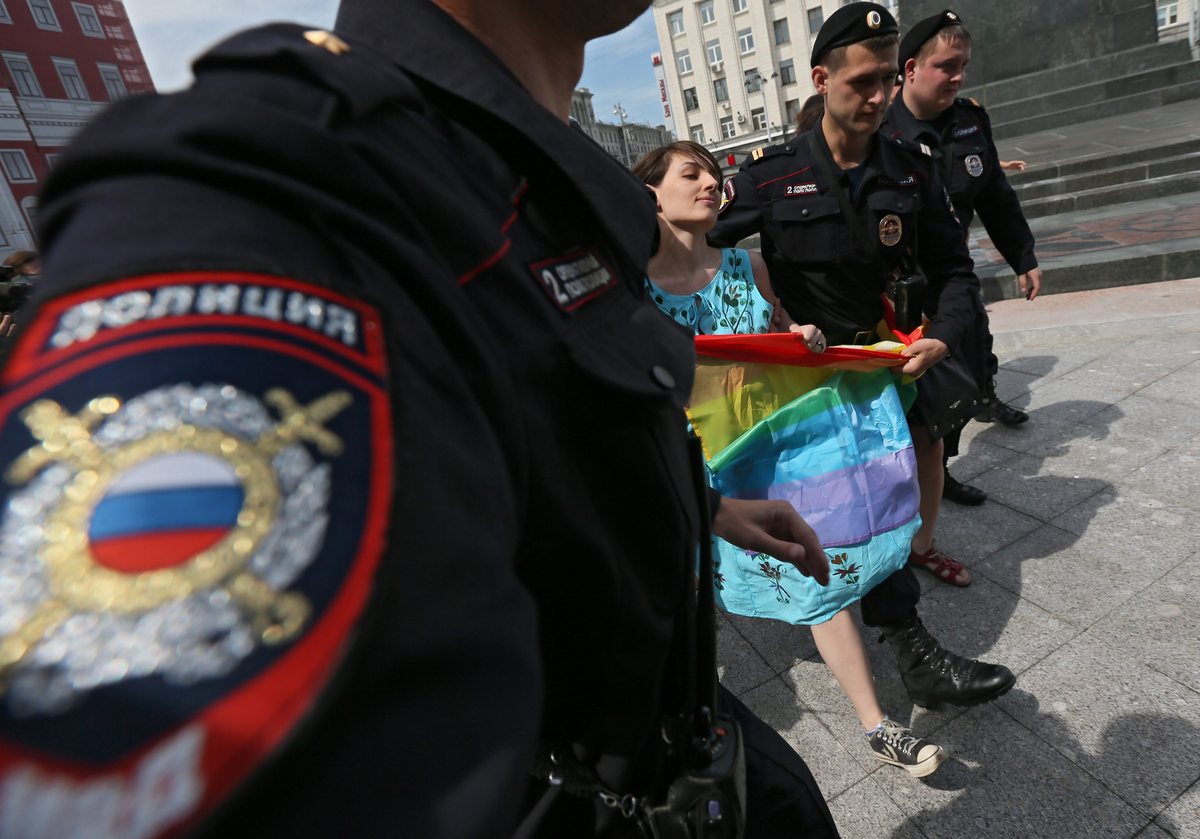 epa03716169 Police officers detain a female member of the LGBT (lesbian, gay, bisexual, and transgender) community, who was trying to participate in a parade in Moscow, Russia, 25 May 2013. Homosexuals gathered to demand respect for people with different sexual preferences. EPA/SERGEI ILNITSKY