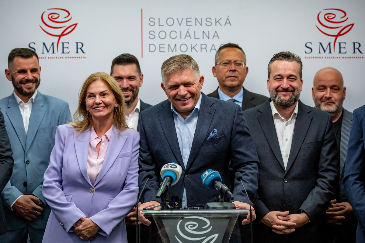 epa10893655 Slovak former Prime Minister and chairman of the Smer-SD party Robert Fico (C) talks to media after Slovakia's parliamentary elections at party's headquarters in Bratislava, Slovakia, 01 October 2023. According to official results, Smer-SD party with leader Robert Fico won the parliamentary elections with almost 23 percent. Progresivne Slovensko party (Progressive Slovakia) ended up behind him, with almost 18 percent. EPA/MARTIN DIVISEK