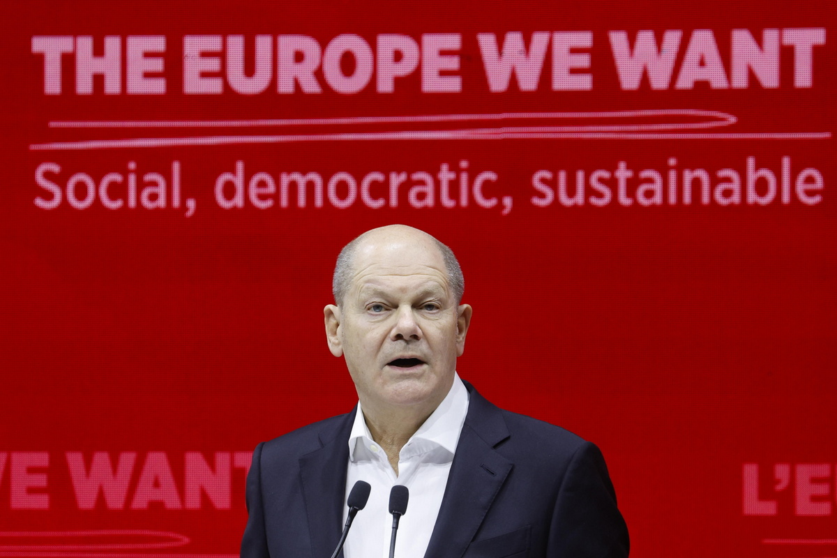 epa11194146 German Chancellor Olaf Scholz speaks during the Party of European Socialists (PES) Election Congress, in Rome, Italy, 02 March 2024. EPA/FABIO FRUSTACI