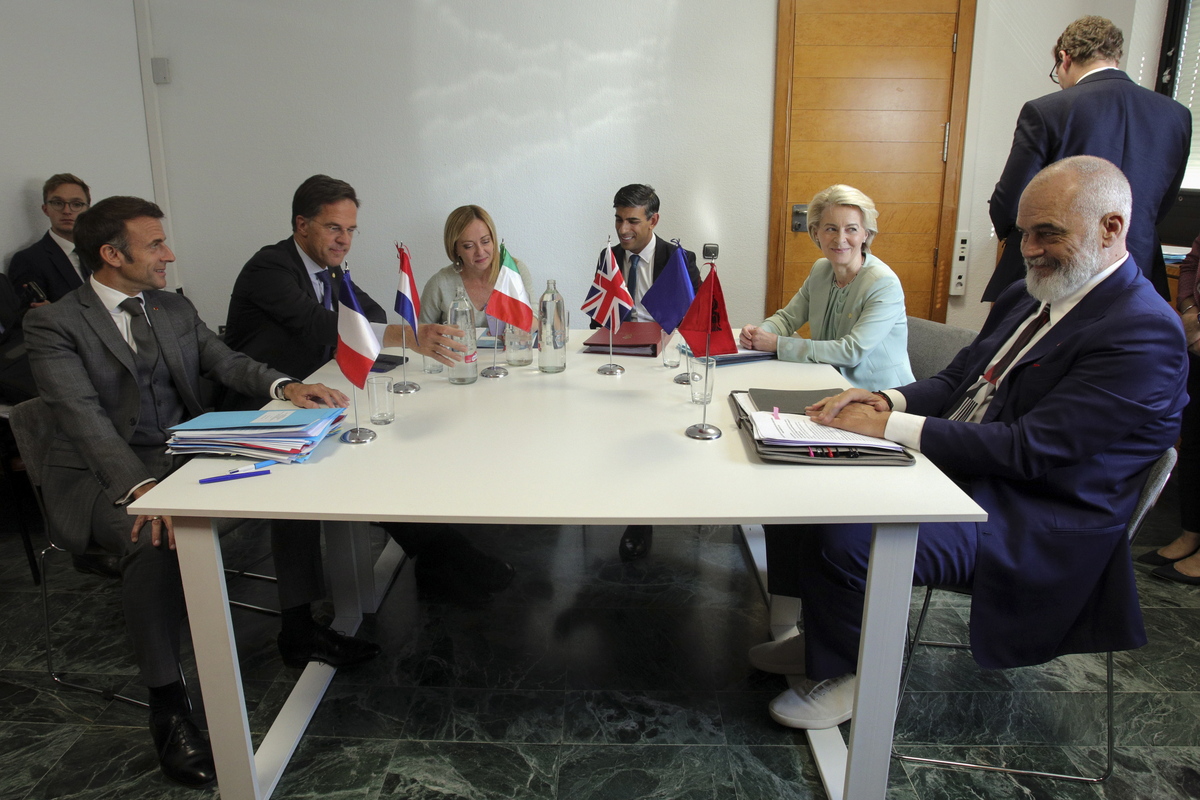 epa10902095 (L-R) French President Emmanuel Macron, Dutch Prime Minister Mark Rutte, Italian Prime Minister Giorgia Meloni, British Prime Minister Rishi Sunak, President of the European Commission Ursula Von Der Leyen and Albania's Primer Minister Edi Rama attend a meeting on the sidelines of the third meeting of the European Political Community in Granada, Spain, 05 October 2023. EPA/PEPE TORRES